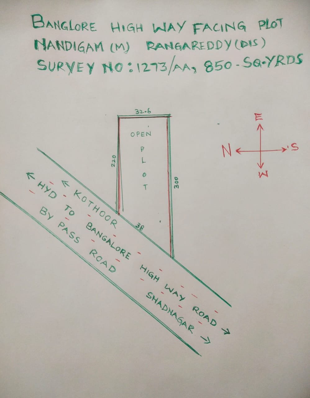 This plot of 850 sq.yds in totality is guarded by Precast Walls and is facing Banglore Highway road and a By pass road of shadnagar…….Which makes it perfectly convenient for Any Commercial Purposes…